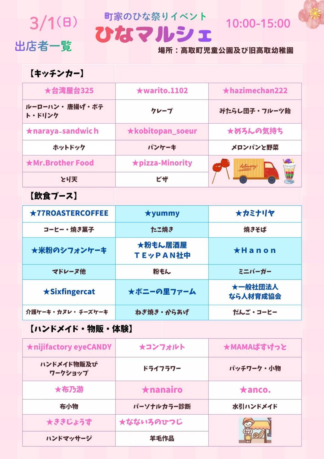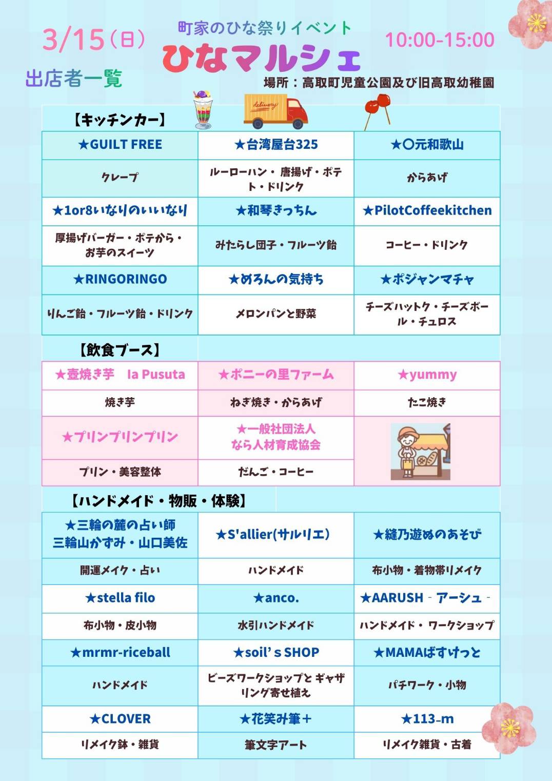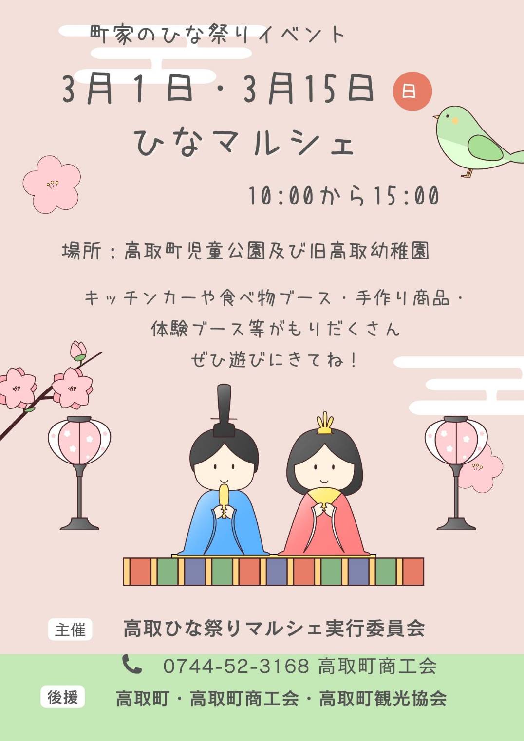 ひなマルシェ お知らせ お雛さんと共にくつろぐマルシェイベント 雛めぐり会場の周辺である児童公園と旧高取幼稚園で、マルシェイベントが開催されます。ひな祭りと共に、お立ち寄りください。 日時 2026年3月1日(日) 10時~15時2026年3月15日(日) 10時~15時 場所 高取町児童公園・旧たかとり幼稚園敷地 出店リスト クリックで拡大できます。 お問い合わせ 高取ひな祭りマルシェ実行委員会(高取町商工会内 0744-52-3168)