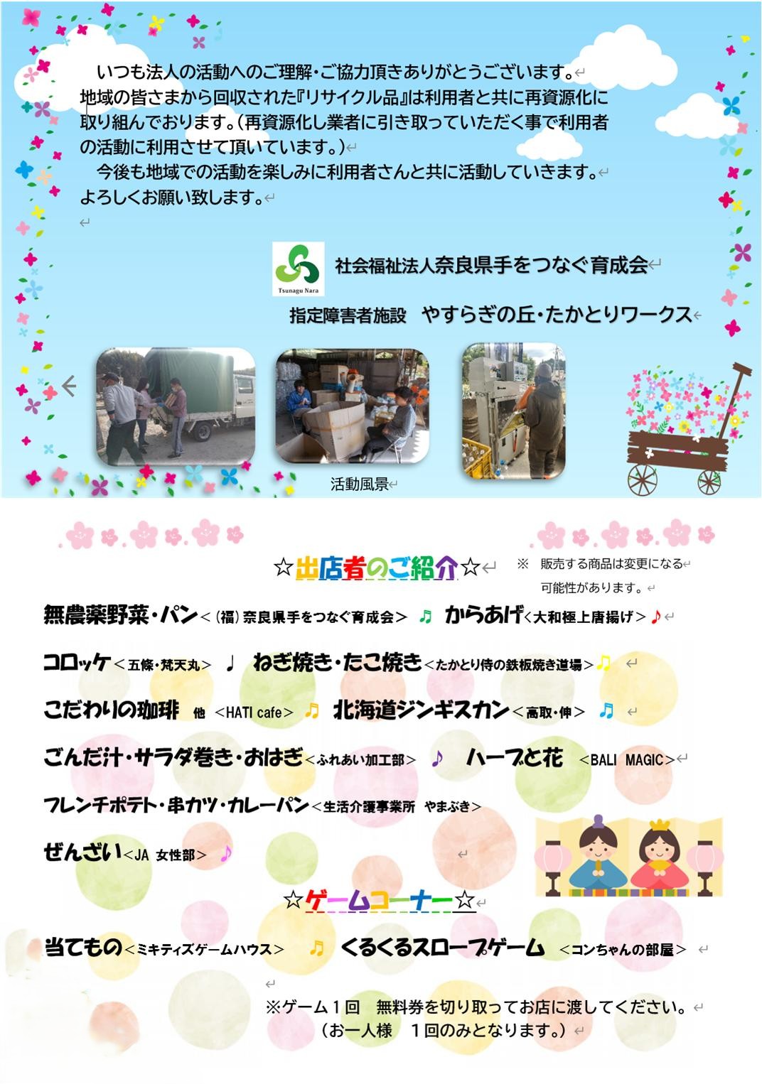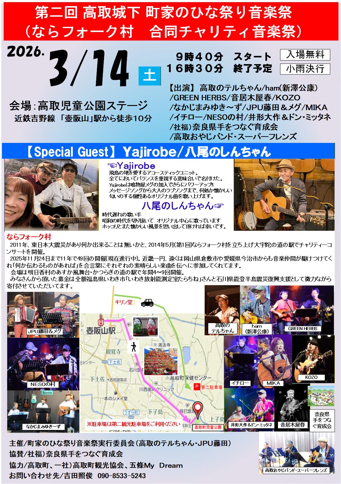 高取城下 町家のひなまつり音楽祭 お知らせ 毎年恒例のひな祭り音楽祭が開催されます。総勢13組の演者が、登場する音楽祭です。 日時 2026年3月14日(土)9時40分~16時30分※雨天時は、内容変更や中止の場合があります。 場所 高取児童公園 ご案内 クリックで拡大できます